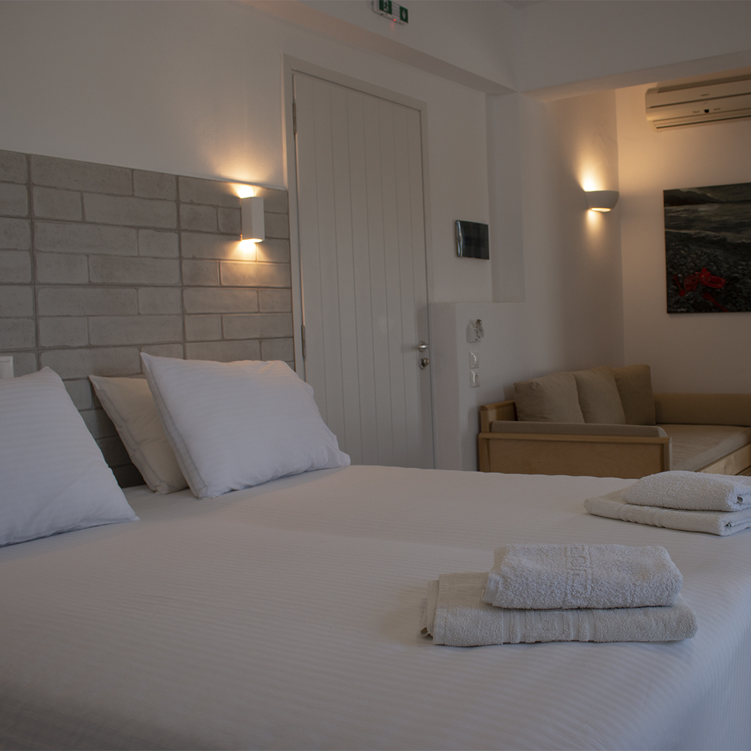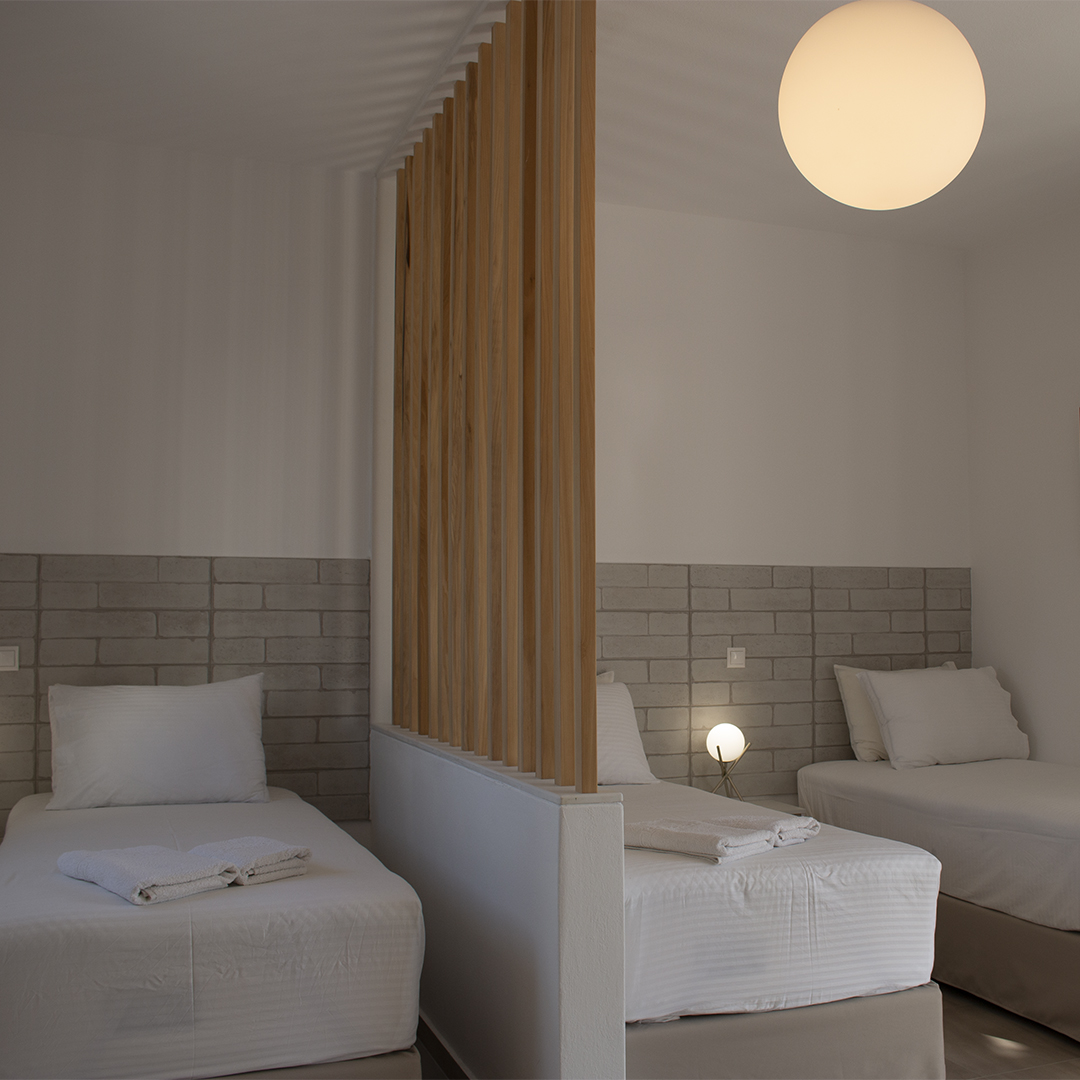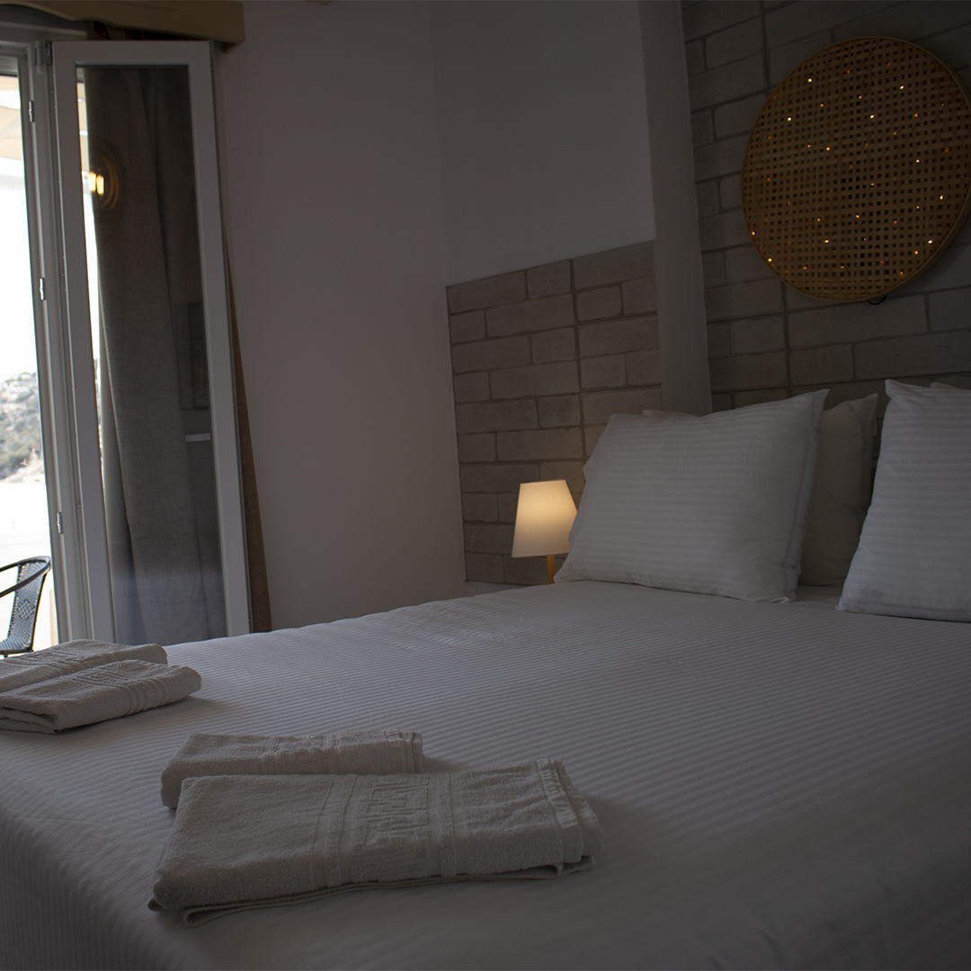 Continuing to the floor of the rooms, you are enchanted by the view of the endless blue, Keros, Amorgos, and the surrounding small islands.