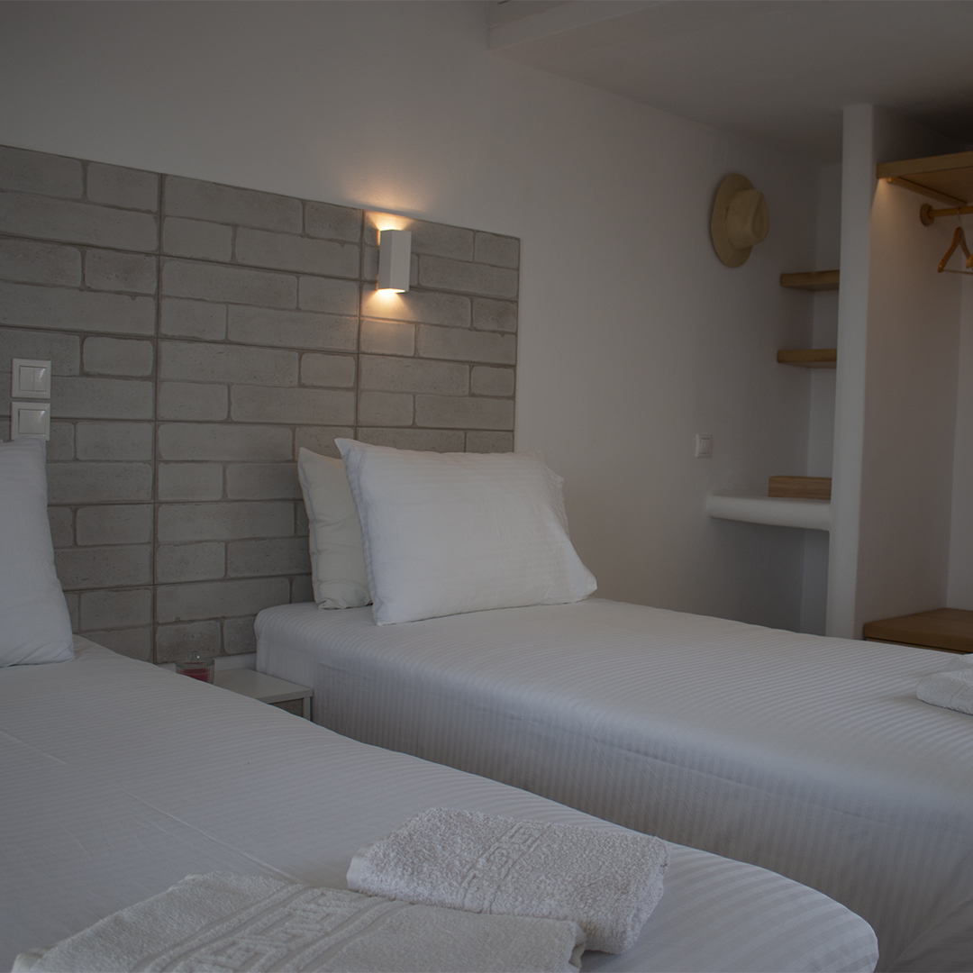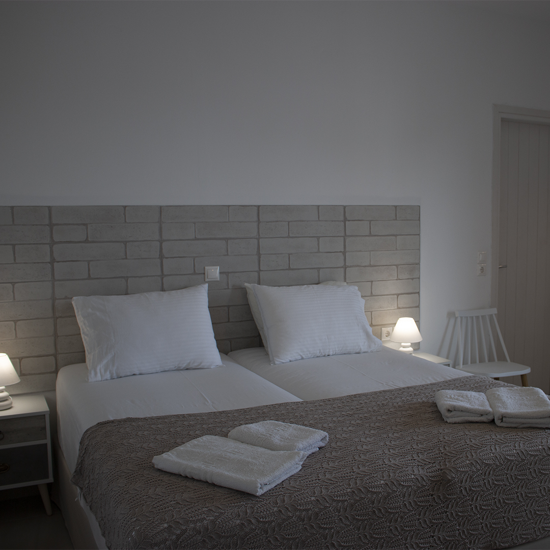 When you enter our complex, you are welcomed by our heavenly garden with its whitewashed stone flower beds, the unique smells of the island soil, and our picturesque chapel in the colors of the Aegean.